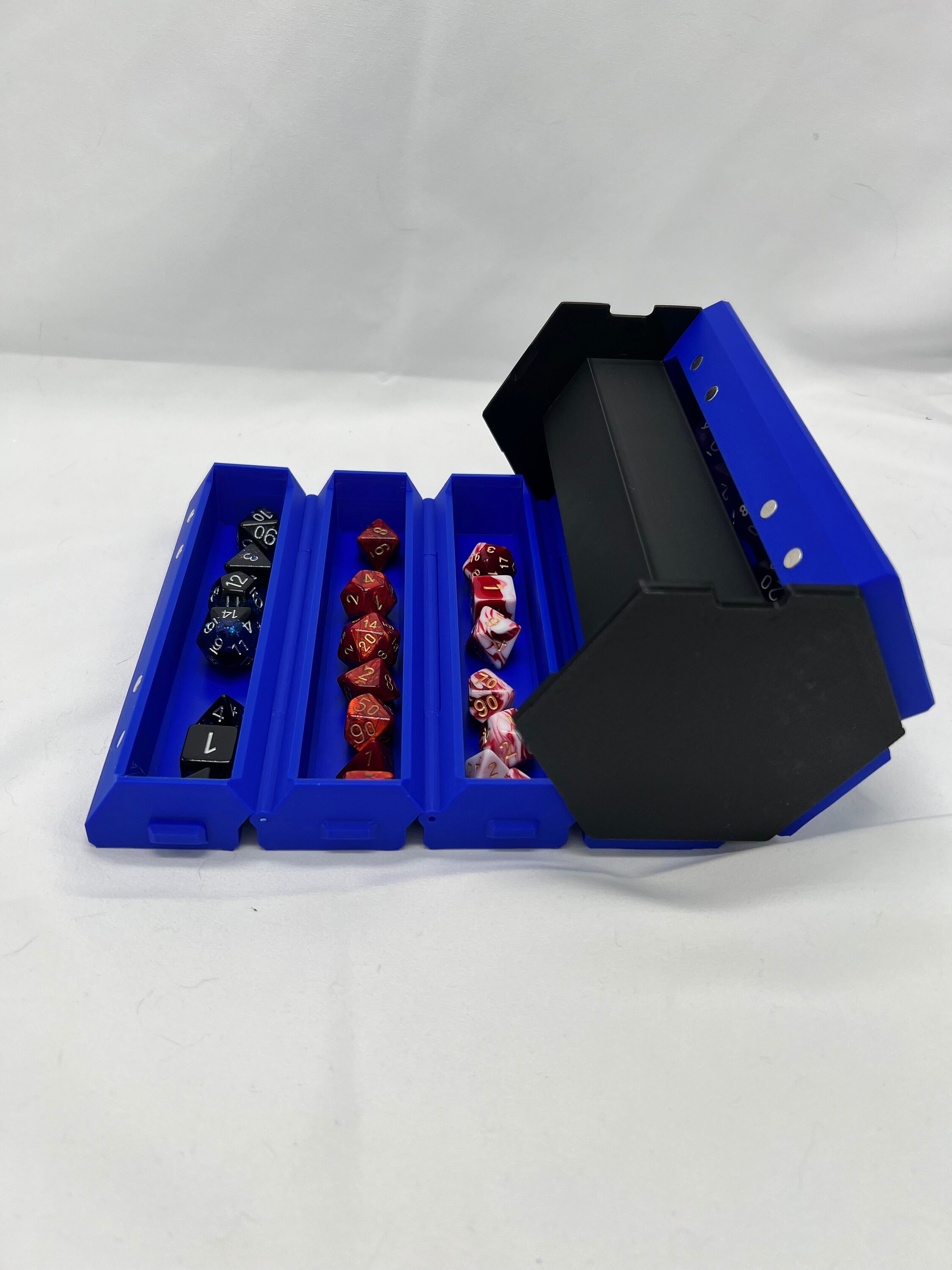 Organize your DnD dice with a fully customizable rollout dice Box. Please note dice not included! This holds around 74 dice, with 5 sets of dice in the rollup portion and 32~ dice in the center core, please note that metal dice are more suitable in the tray then the core. Choose your 2 colors. Bins are available in Hexagon, Square, Circle and plain. If not noted in the personalization the 6 bins will the 5 hexagon and 1 plain. The plain bin can either hold dice or trays for display dice which can be purchased here -> <Coming soon!!>