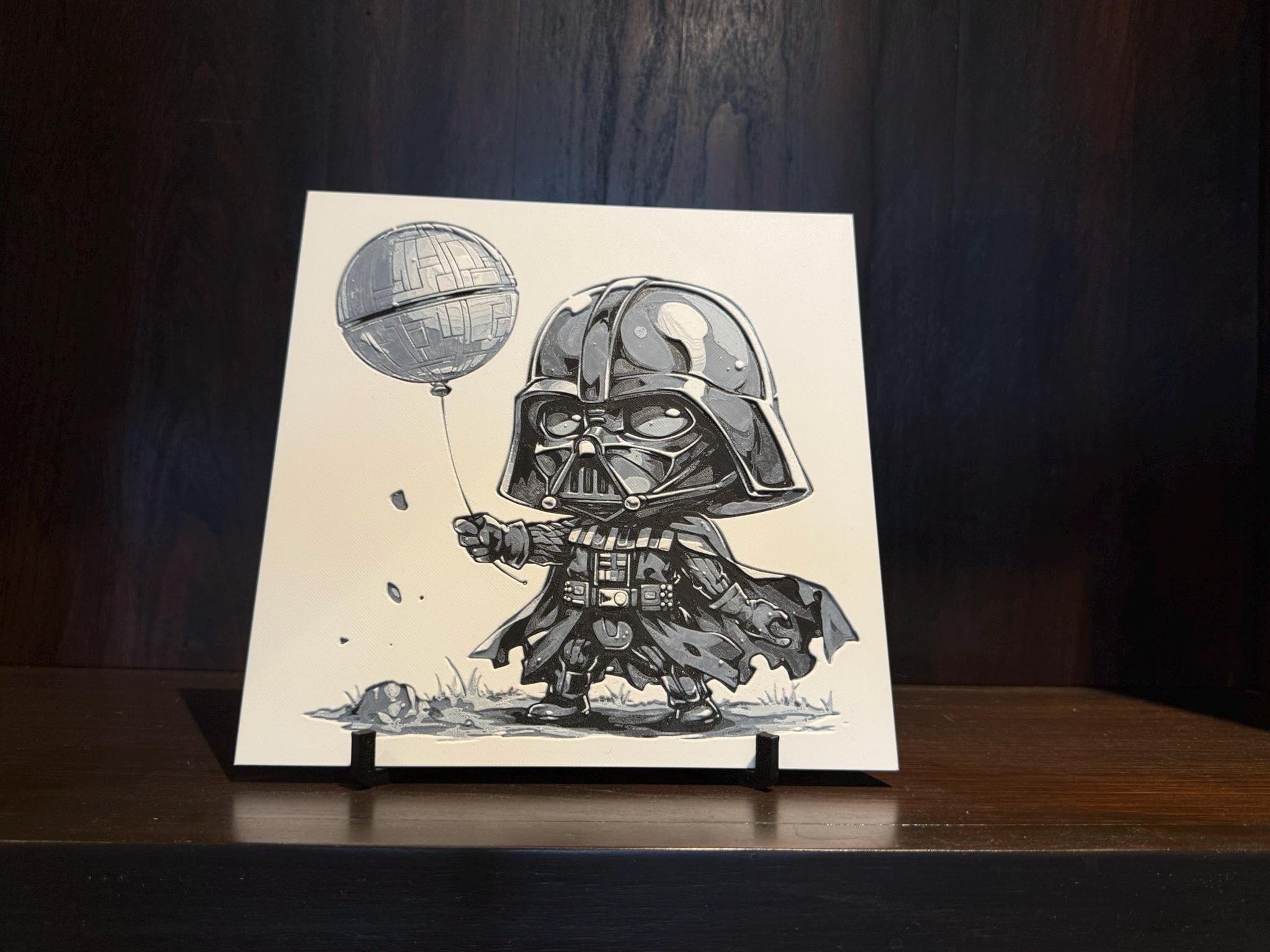 A hueforge of Darth Vader chibi holding a Death Star balloon.