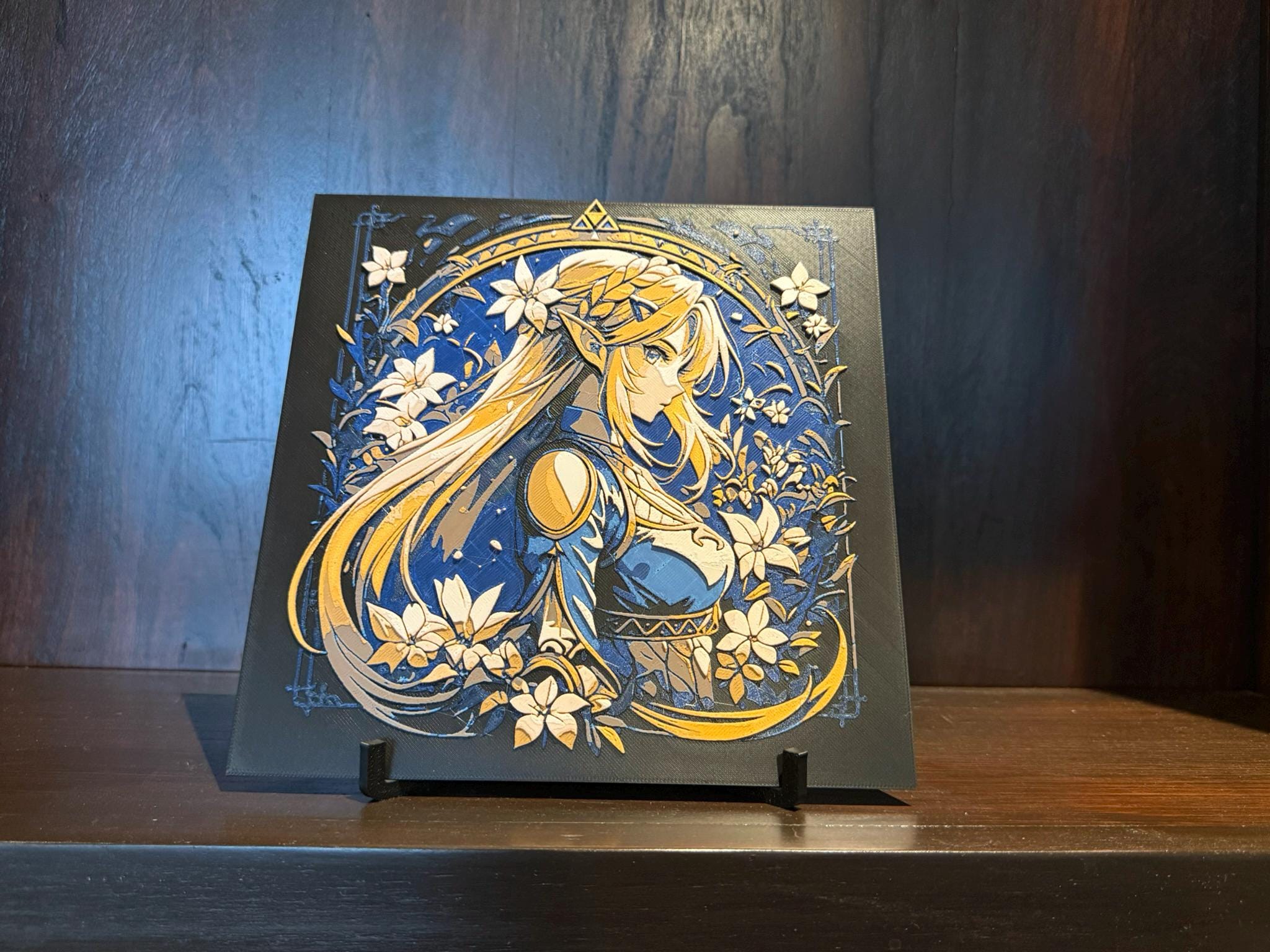 This elegant art panel features a serene fantasy warrior maiden surrounded by delicate blossoms and flowing botanical elements. Rendered in a refined blue and gold palette, the design blends strength and grace, capturing a moment of quiet resolve and beauty.